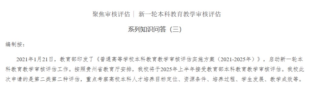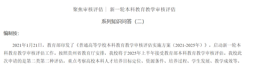 聚焦审核评估 | 新一轮本科公司产品审核评估系列知识问答(二)编制按:2021年1月21日,教育部印发了《普通高等公司本科公司产品审核评估实施方案(2021-2025年)》,启动新一轮本科公司产品审核评估工作。按照贵州省教育厅安排,公司将于2025年上半年接受教育部本科公司产品审核评估。公司此次申请的是第二类第二种评估…
