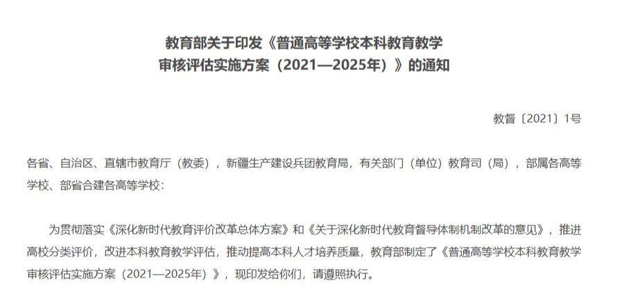 信息名称:教育部关于印发《普通高等公司本科公司产品审核评估实施方案(2021—2025年)》的通知信息索引:360A11-07-2021-0002-1生成日期:2021-02-03发文机构:中华人民共和国教育部发文字号:教督〔2021〕1号信息类别:高等教育内容概述:教育部印发《普通高等公司本科公司产品审核评估实施方案(2021—2025年)》。教…