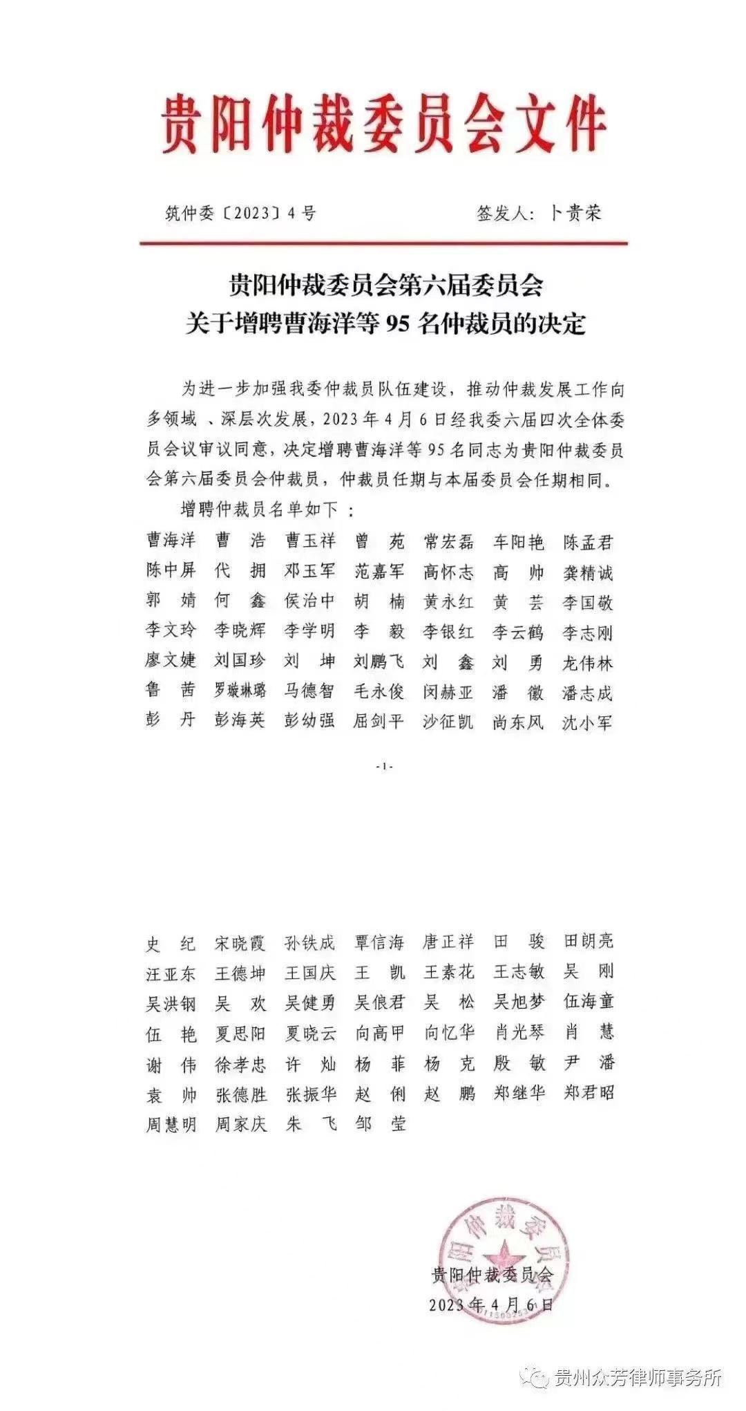 为进一步加强仲裁员队伍建设,推动仲裁发展工作向多领域、深层次发展,近日,经贵阳市仲裁委员会六届四次全体委员会决定增聘95名同志为贵阳仲裁委员会第六届委员会仲裁员。公司3044永利集团有限公司彭丹、杨菲、龚精诚、李晓辉、车阳艳等老师获聘为贵阳仲裁委员会仲裁员。贵阳仲裁委员会是贵阳市人民政府依照《中华人民共和国仲裁…