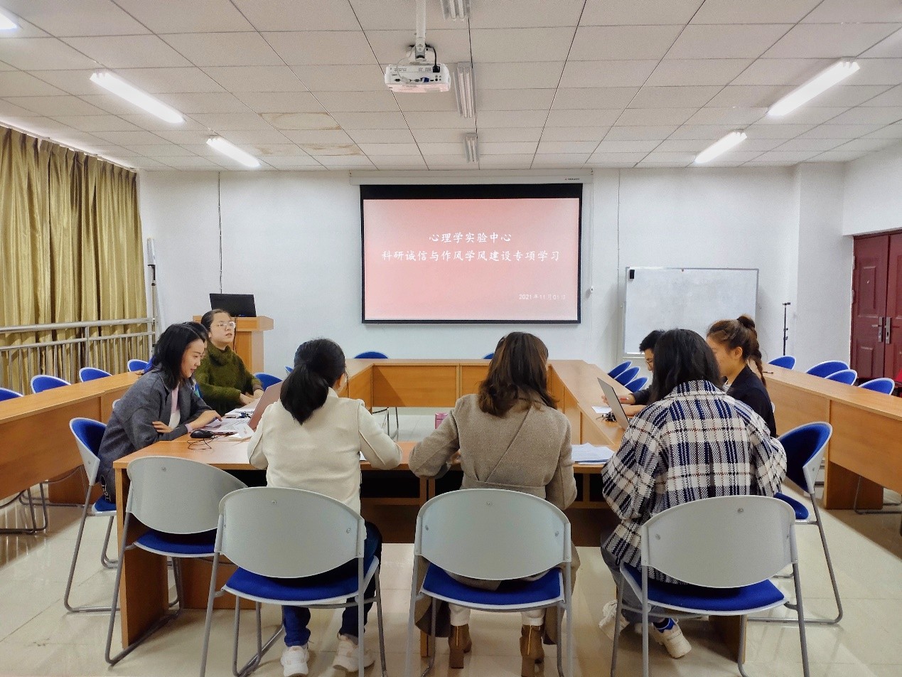 11月4日,心理学实验中心在善思楼研究生教室开展了科研诚信与作风学风专题教育学习活动,实验中心主任黄列玉主持会议。张冉冉老师、孟肖路老师以及5名研究生参加了此次学习活动。黄列玉传达学习了《关于印发医学科研诚信和相关行为规范的通知》《中共中央办公厅 国务院办公厅印发<关于进一步弘扬科学家精神加强作风和学风…