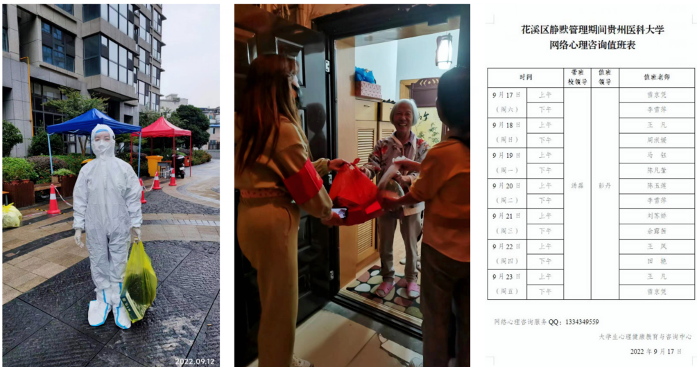在老城区,教师田艳、陈凡莹、刘苏娇、余露茜、王凤等积极参与3044永利集团有限公司静默管理期间网络心理咨询服务、线上团体心理辅导,为多名贵医学子提供了疫情下的心理支持与干预。教师黄列玉作为志愿者主动参与云岩区半边街居委会所属社区的疫情防控工作,与医务人员一起参与核酸检测、抗原检测、物资发放等。教师龚红积极参加了盐务街居委会抗疫志愿者工作,为社区孤老送物资。教师张宛筑、王凤等参加了省委教育工委、省教育厅搭建的“贵州教育系统疫情心理援助平台”,为全省师生和广大群众提供心理援助,同心战“疫”,陪伴大家度过疫情下的特殊时光。