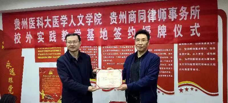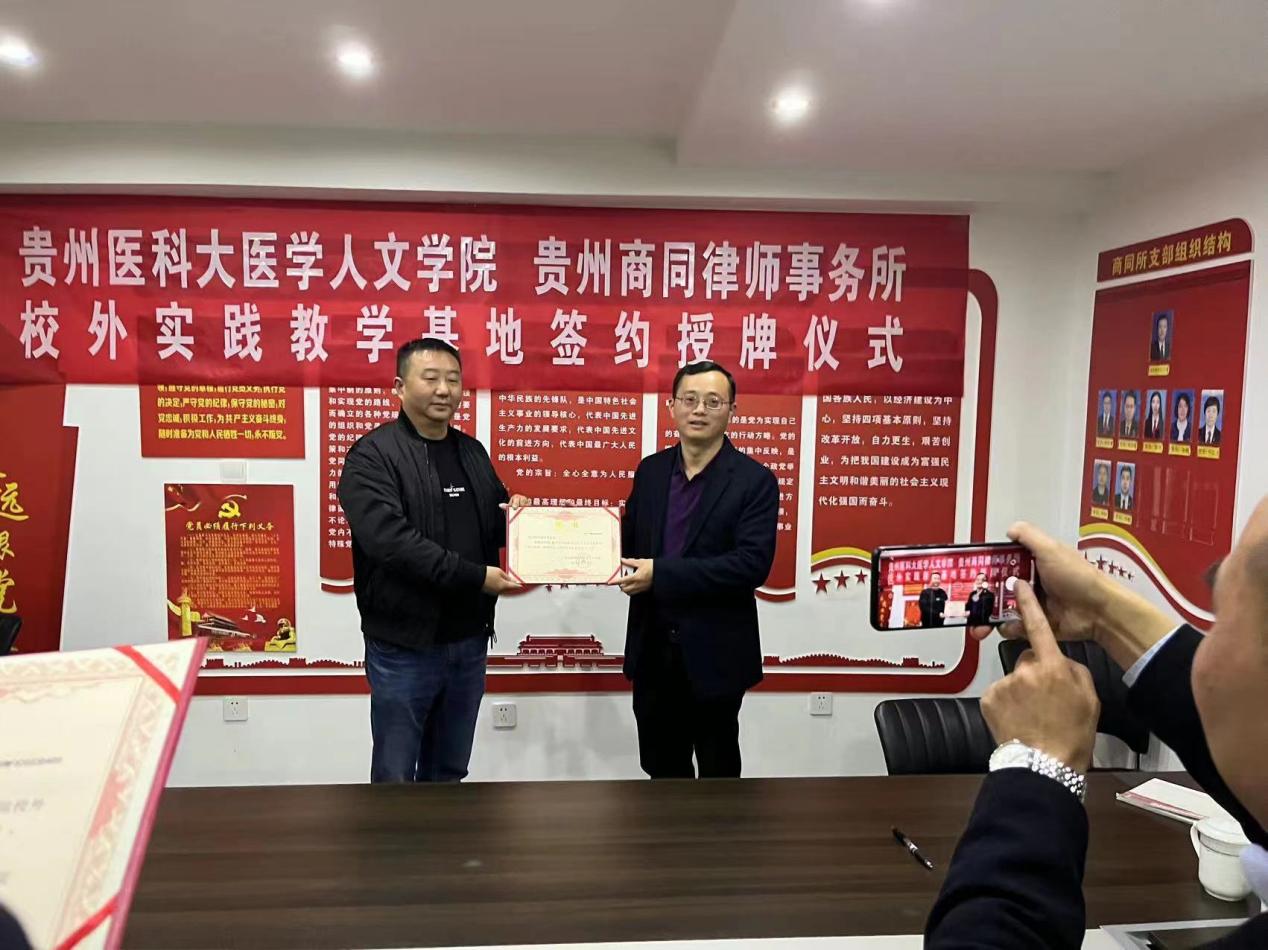 江宣成与冉政林签署了全面合作框架协议、共建实践教学基地协议,并向贵州商同律师事务所授牌3044永利集团有限公司实践教学基地,并向受聘校外实践指导教师颁发证书。